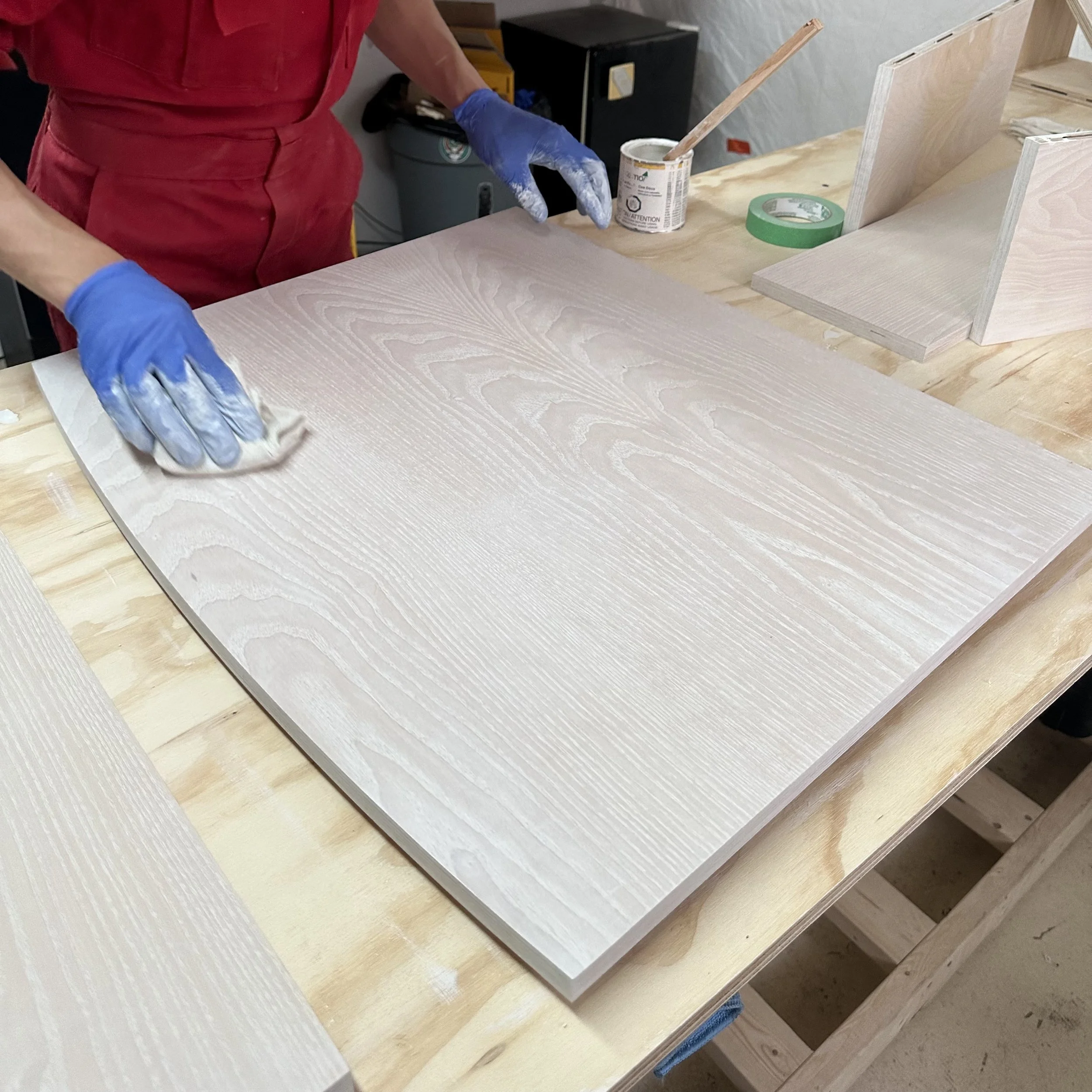 Once the wood is in our shop, we sort each panel, trim them to spec, then assemble the boxes using aesthetically invisible joinery and sturdy cabinetmaking techniques. After the glue is cured, the clamps come off, and the cabinets are prepared for finishing. The cabinet edges are trimmed flush, and the surfaces are sanded silky smooth.